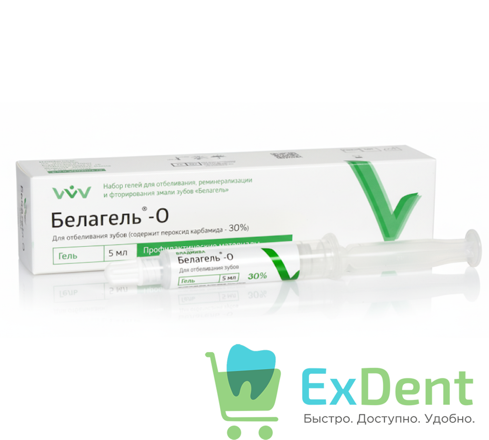 Белагель О — универсальная отбеливающая гелевая система с пероксидом карбамида в качестве наиболее современного и щадящего отбеливающего агента. Пероксид ; источник атомарного кислорода, под действием которого происходит расщепление органических веществ, окрашивающих ткани зуба. Активный кислород устраняет бактерии, способствующие формированию неприятного запаха. Отбеливающий гель содержит 30% воды, следовательно, не происходит высушивание и обезвоживание твердых тканей. Зубы не теряют блеск.Входящие в состав Белагель О ионы калия предотвращают появление чувствительности зубов.