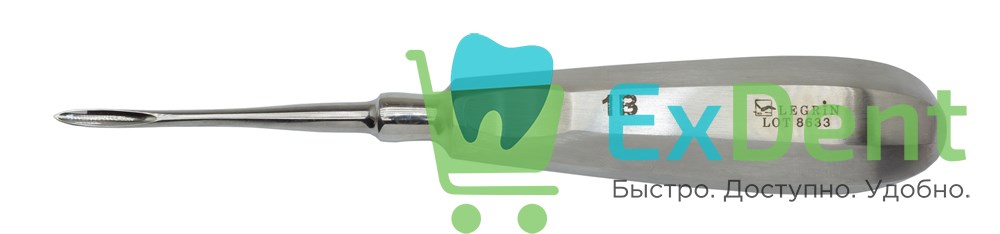 Штыковидный элеватор (элеватор Леклюза). Соединительный стержень элеватора штыкообразно изогнут (рис. 6.8, г). Рабочая часть (щечка) имеет копьевидную форму, сужается и истончается к концевому отделу. Одна поверхность щечки гладкая, другая — закругленная. Ручка круглая, более толстая в средней части, расположена перпендикулярно по отношению к соединительному стержню и рабочей части. За счет штыковидною изгиба продольная ось щечки и ось соединительного стержня расположены в параллельных плоскостях. Элеватор предназначен для удаления третьего нижнего большого коренною зуба.