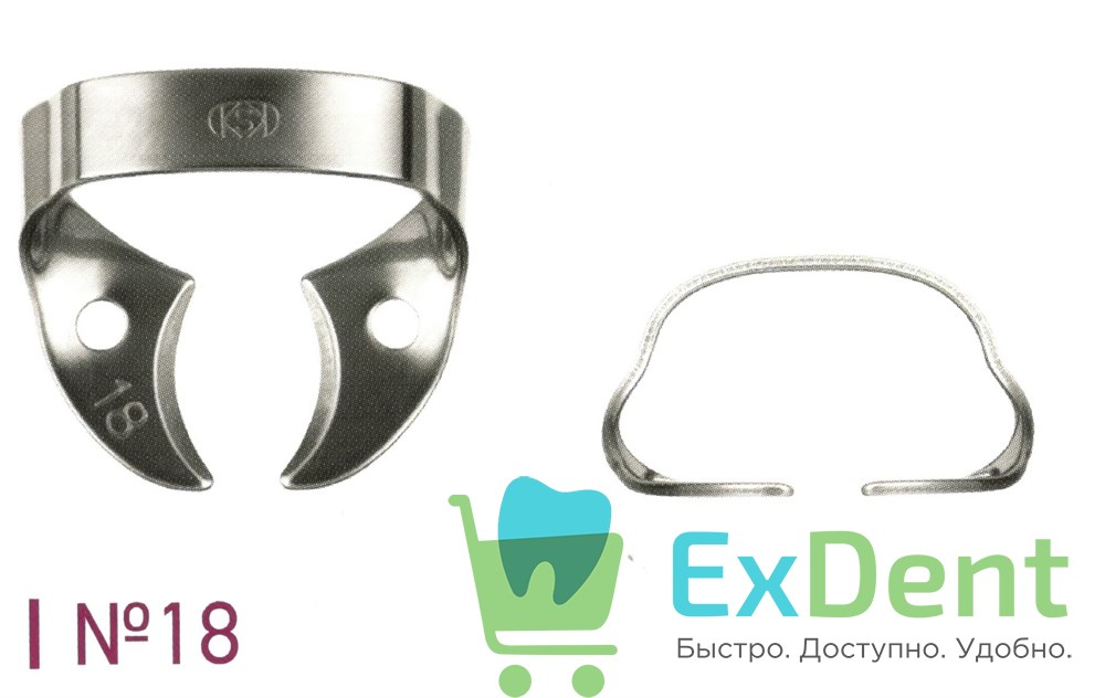№18. Кламп для моляров верхней и нижней челюсти. Без крыльев. Наружные края щечек закруглены для большей компактности. Типичная область применения – как якорный кламп при протяженных участках изоляции.