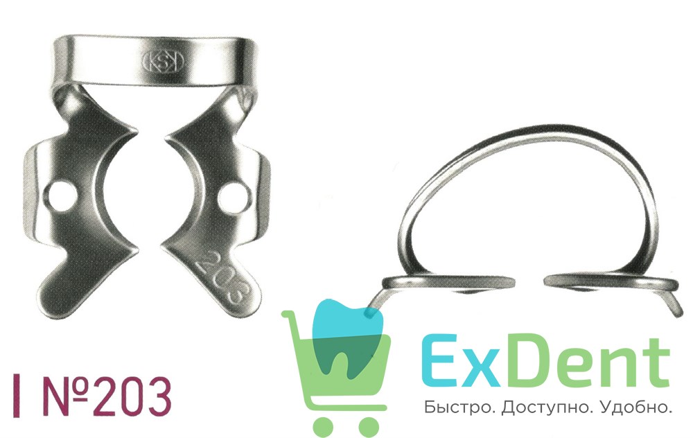 №203. Кламп для моляров верхней и нижней челюсти, справа. Подходит для установки на зубы с невыраженным экватором, возможно со значительно разрушенной медиальной коронковой поверхностью. Кламп имеет асимметричные щечки и дугу небольшого радиуса.