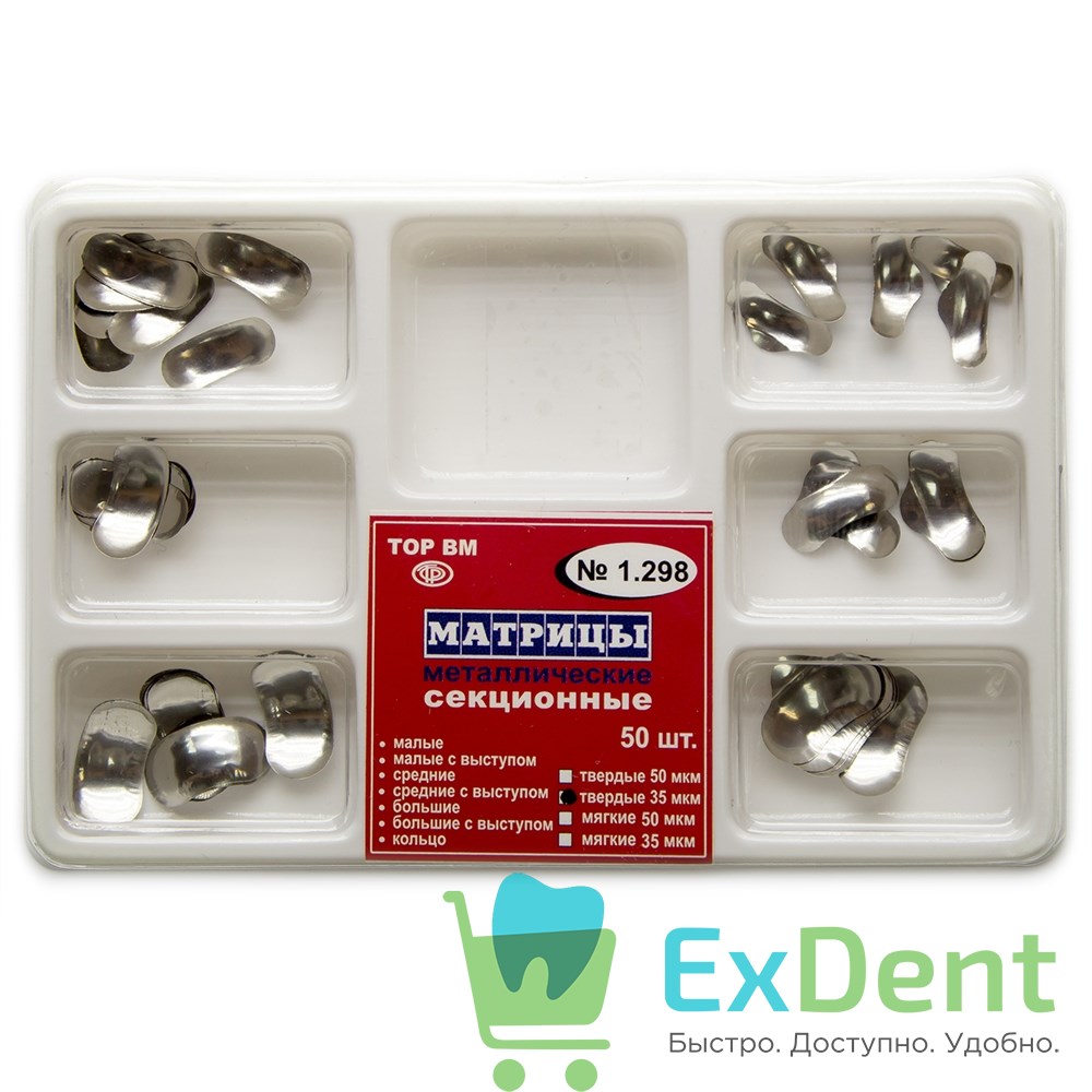 Матрицы контурные секционные металлические для разделения аппроксимальных поверхностей соседних зубов при реставрации II типа. Объемные, вогнутые, сформованы из специальной коррозионностойкой стали.