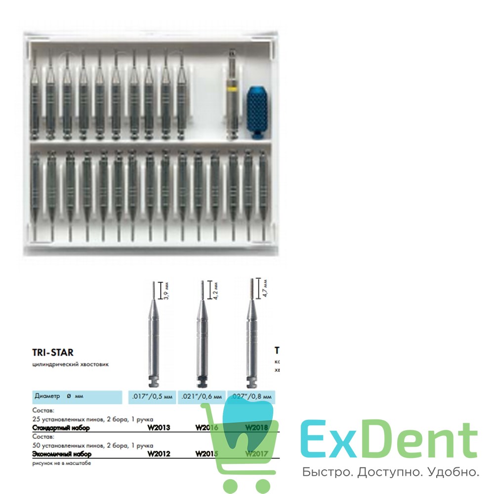 Штифты титановые парапульпарные TRI-STAR ,021"/0.6 мм (50 шт + 2 бора + ручка)