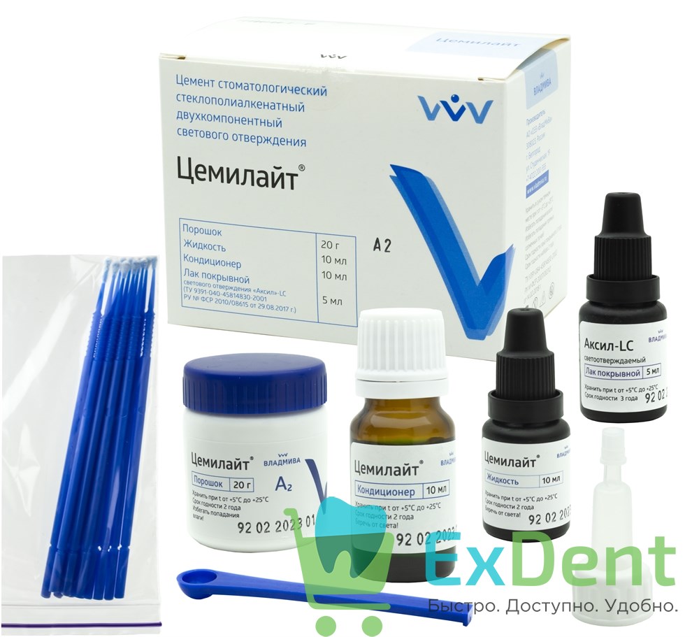 Стеклоиономерный цемент светового отверждения Цемилайт amp; выпускается в виде комплекта порошок-жидкость, обладает высоким химическим сродством как к полимерным материалам, так и к тканям зуба, обеспечивает надежное краевое прилегание.